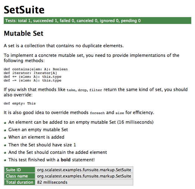 FunSuitethat usesmarkup:package org.scalatest.examples.funsuite.markup import collection.mutable import org.scalatest._ class SetSuite extends FunSuite with GivenWhenThen { markup { """ Mutable Set ----------- A set is a collection that contains no duplicate elements. To implement a concrete mutable set, you need to provide implementations of the following methods: def contains(elem: A): Boolean def iterator: Iterator[A] def += (elem: A): this.type def -= (elem: A): this.type If you wish that methods like `take`, `drop`, `filter` return the same kind of set, you should also override: def empty: This It is also good idea to override methods `foreach` and `size` for efficiency. """ } test("An element can be added to an empty mutable Set") { Given("an empty mutable Set") val set = mutable.Set.empty[String] When("an element is added") set += "clarity" Then("the Set should have size 1") assert(set.size === 1) And("the Set should contain the added element") assert(set.contains("clarity")) markup("This test finished with a **bold** statement!") } }Although all of ScalaTest's built-in reporters will display the markup text in some form, the HTML reporter will format the markup information into HTML. Thus, the main purpose of