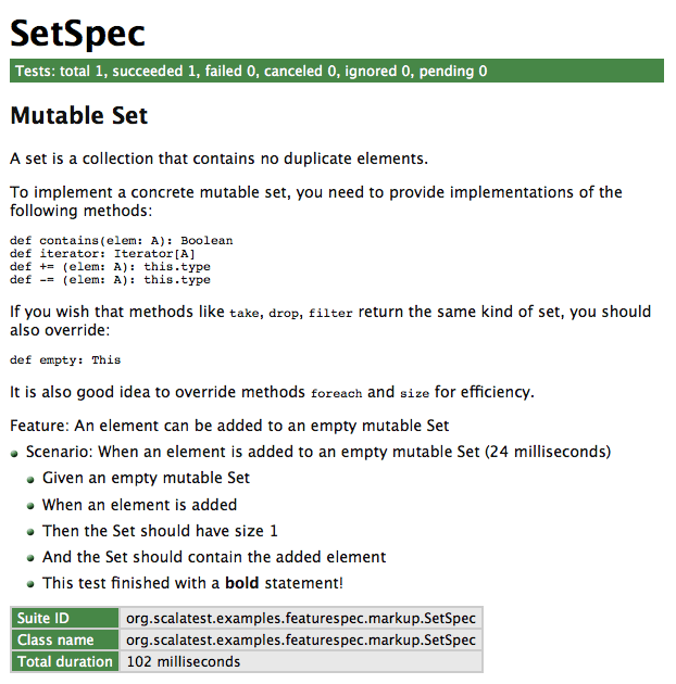 scala> import org.scalatest._ import org.scalatest._ scala> class ArithmeticSuite extends FunSuite with Matchers { | test("addition works") { | 1 + 1 should equal (2) | } | ignore("subtraction works") { | 1 - 1 should equal (0) | } | test("multiplication works") { | 1 * 1 should equal (2) | } | test("division works") (pending) | } defined class ArithmeticSuite scala> run(new ArithmeticSuite) ArithmeticSuite: - addition works - subtraction works !!! IGNORED !!! - multiplication works *** FAILED *** 1 did not equal 2 (:16) - division works (pending)