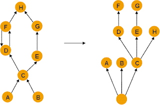 Using the the "dominates" relationship we can create a dominator tree out of the the graph of objects in memory. At each node of this tree we store the amount of memory that would be freed (= retained size). At the top of the tree we have a "virtual" root object, which we also use to represent objects that don't have "real" single dominator. Here's an example of an object tree (on the left) and the corresponding dominator tree (on the right) :