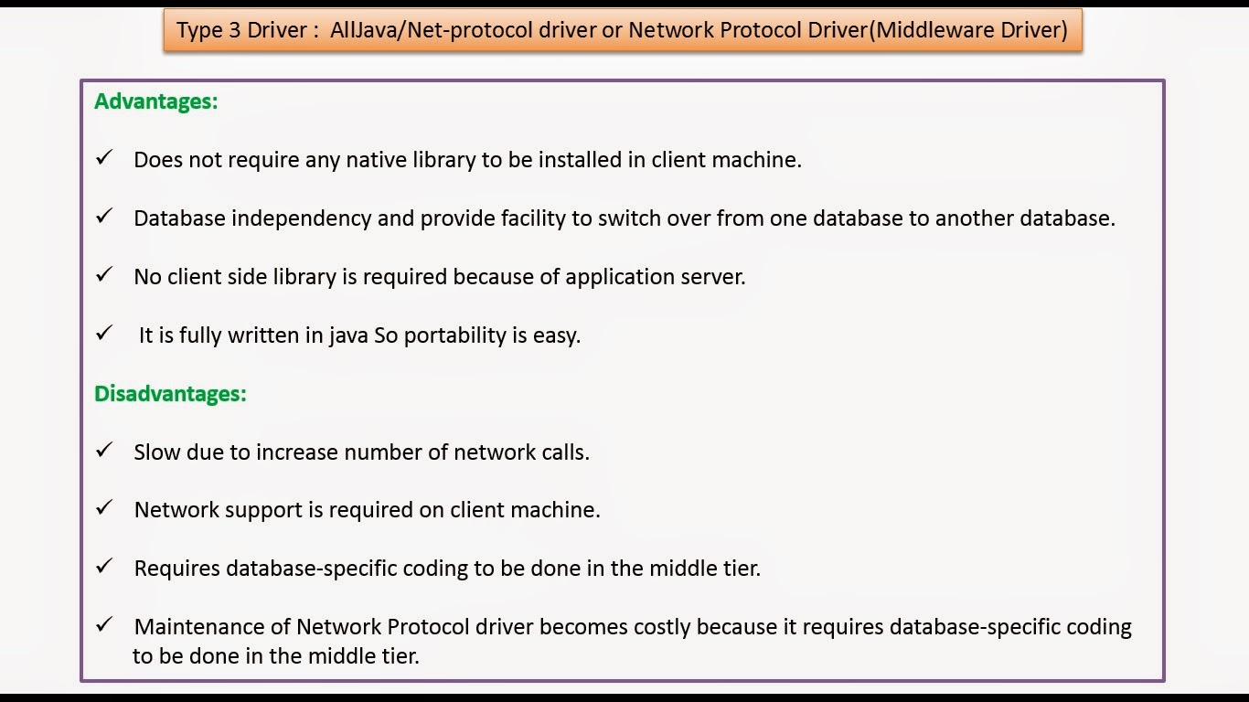 Type 3 Driver : AllJava/Net-protocol driver or Network Protocol Driver(Middleware Driver) 0 replies on 1 page. |