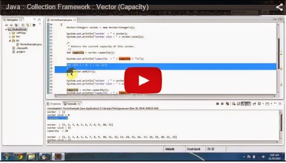 Click here to watch in Youtube :https://www.youtube.com/watch?v=3MaZyBXc-_w&list=UUhwKlOVR041tngjerWxVccwVectorExample.java import java.util.Vector;