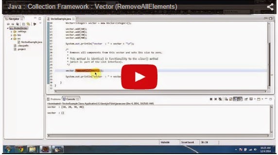 Click here to watch in Youtube :https://www.youtube.com/watch?v=JeO5vasM-N4&list=UUhwKlOVR041tngjerWxVccwVectorExample.java import java.util.Vector;