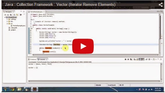 Click here to watch in Youtube :https://www.youtube.com/watch?v=NyraFk5FXUk&list=UUhwKlOVR041tngjerWxVccwVectorExample.java import java.util.Iterator;