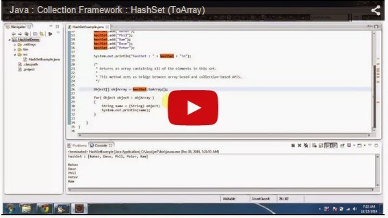 Click here to watch in Youtube :https://www.youtube.com/watch?v=s4RW7nvgZa4&list=UUhwKlOVR041tngjerWxVccwHashSetExample.java import java.util.HashSet;