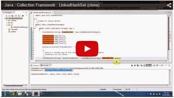 Click here to watch in Youtube :https://www.youtube.com/watch?v=QjZ4EMY6BbI&list=UUhwKlOVR041tngjerWxVccwLinkedHashSetExample.java import java.util.LinkedHashSet;