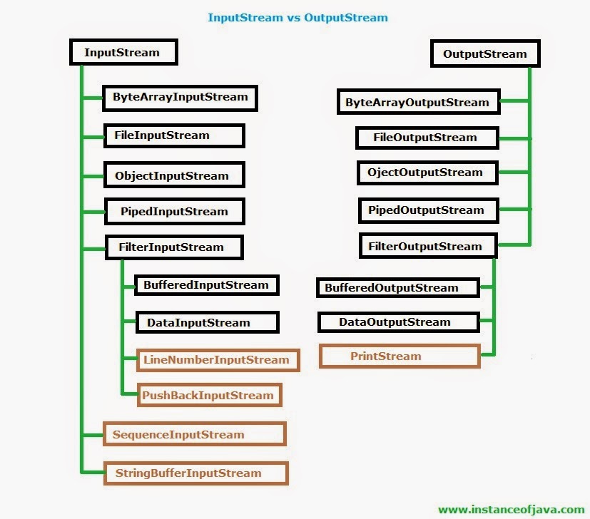 For each type of source and destination in java.io package oracle given a separate class. InputStream Class: ByteArrayInputStream FileInputStream FilterInputStreamBufferedInputStream DataInputStream LineNumberInputStream PushbackInputStream ObjectInputStream PipeInputStream SequenceInputStream StringBufferInputStream IputStream Class Methods: Since InputStream class is the super class for all input stream classes. It has below methods with general implementation for all sub classes. 1.public int available() throws IOException : Checking available bytes to read. 2.public abstract int read() throws IOException : 3.public int read(byte[] b) throws IOException : 4.public int read(byte[] b, int off, int length) throws IOException : Reading selected range of bytes. 5.public boolean markSupported() : Checking is this Stream supports marking. 6.public void mark(int readLimit) : Marking current position of stream. 7.public void reset() throws IOException : Placing the control at marked place. 8.public long skip(long n) throws IOException : Skip reading given range of bytes. 9.public void close() throws IOException : OutputStream Class: ByteArrayOutputStream FileOutputStream FilterOutputStreamBufferedOutputStream DataOutputStream PrintStream ObjectOutputStream PipeOutputStream OutputStream class methods: Since OutputStream is the super class of all binary output stream classes it has below method with general implementation for all sub classes. 1.public abstract void write(int i)throws IOException: Writing one by at time to an output stream. 2.public void write(byte[] b) throws IOException : Writing stream of bytes to an output stream. 3.public void write(byte []b , int off, int length) throws IOException : Writing range of stream of bytes to an output stream. 4.public void flush() throws IOException : Flush all bytes to destination from output Stream. 5.public void close() throws IOException : FileInputStream and FileOutputStream: These classes are used to read and write data as byte from File. Basically these two streams are used as basic data source and destination for other streams. DataInputStream and DataOutputStream: These two classes are used to read and write data as primitive data. Basically these two streams are used to add capability to another input stream and output stream to read and write data as primitive types. ObjectInputStream and ObjectOutputStream: BufferedInputStream and BufferedOutputStream: These two classes are used to read and write data as buffers. Basically these two streams are used to improve reading and writing performance of other streams. SequenceInputStream: This class is used to read data from multiple InputStreams Sequentially. PrintStream: PrintStream class is filter output stream class . Its adds functionality to another OutputStream, namely the ability to print representations of various data values conveniently. Basic steps to perform IO Operations: Create stream class object based on source and destination. Call read() method to read data from the source. Call write() method to write data to the destination. For instance , to perform IO Operations on files we must create