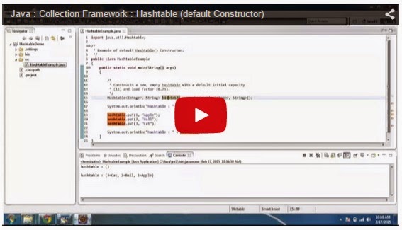 Click here to watch in Youtube : https://www.youtube.com/watch?v=Eg7sbK5WgzY&list=UUhwKlOVR041tngjerWxVccwHashtableExample.java import java.util.Hashtable;