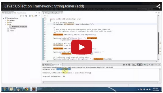 Click here to watch in Youtube : https://www.youtube.com/watch?v=56b7JMhq1ro&list=UUhwKlOVR041tngjerWxVccwStringJoinerExample.java import java.util.StringJoiner;