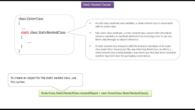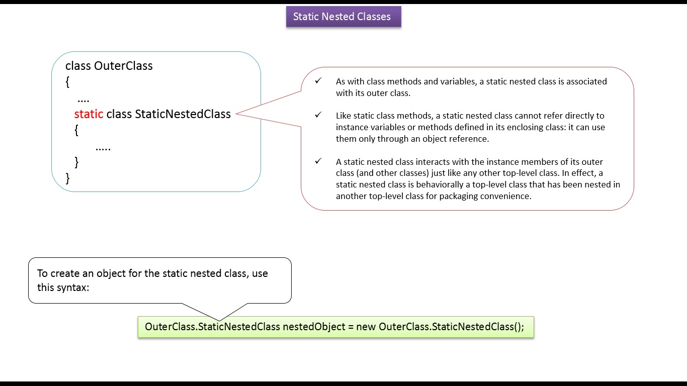 OuterClass.StaticNestedClass nestedObj = new OuterClass.StaticNestedClass();