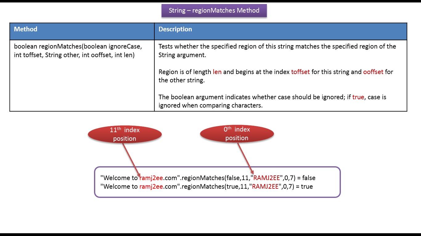 .print("\"Welcome to ramj2ee.com\".regionMatches(true,11,\"RAMJ2EE\",0,7) = ");