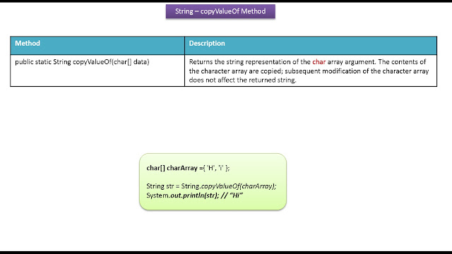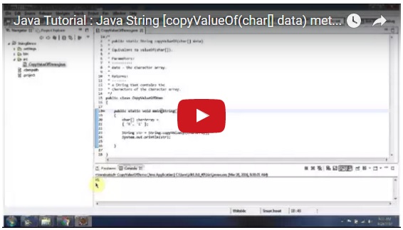 Java Tutorial : Java String [copyValueOf(char[] data) method] 0 replies on 1 page. |