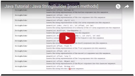 Java Tutorial : Java StringBuilder [insert methods] 0 replies on 1 page. |