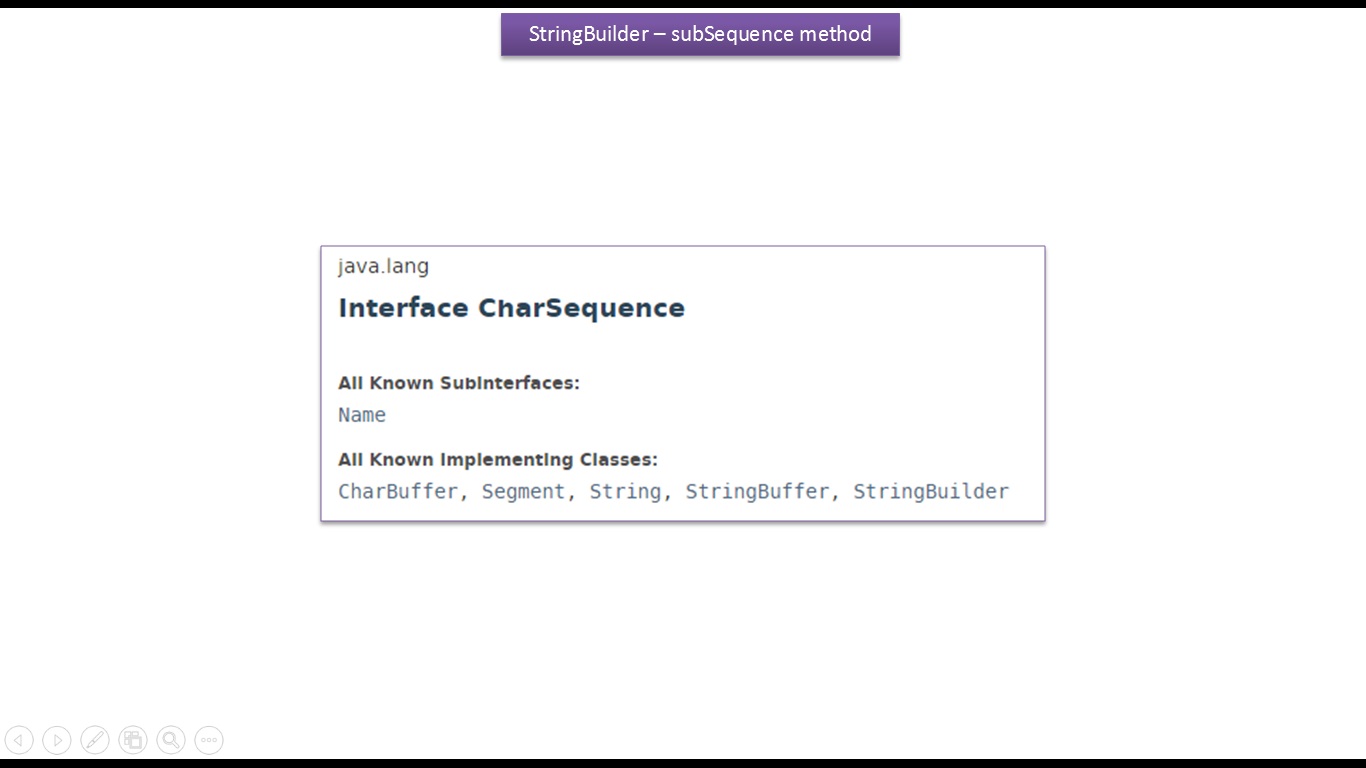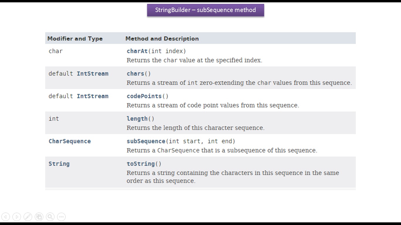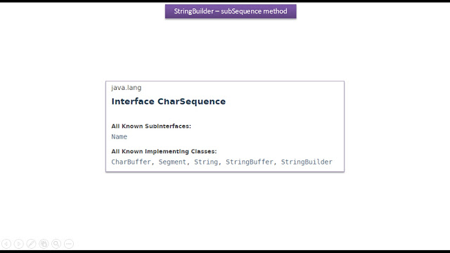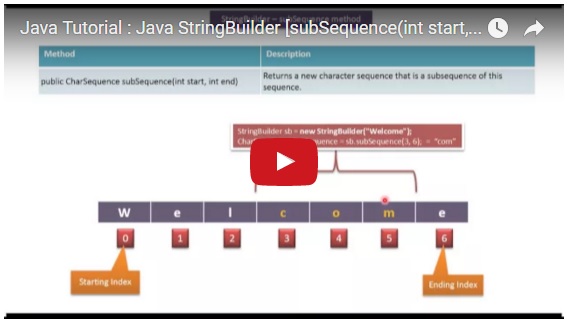 | Java Tutorial : Java StringBuilder [subSequence(int start, int end) method] |