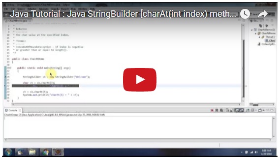 Java Tutorial : Java StringBuilder [charAt(int index) method] 0 replies on 1 page. |