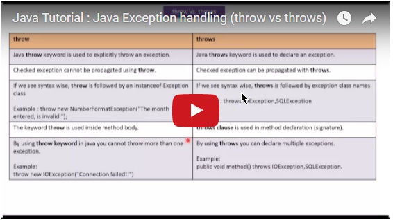Java Tutorial : Java Exception handling (throw vs throws) 0 replies on 1 page. |