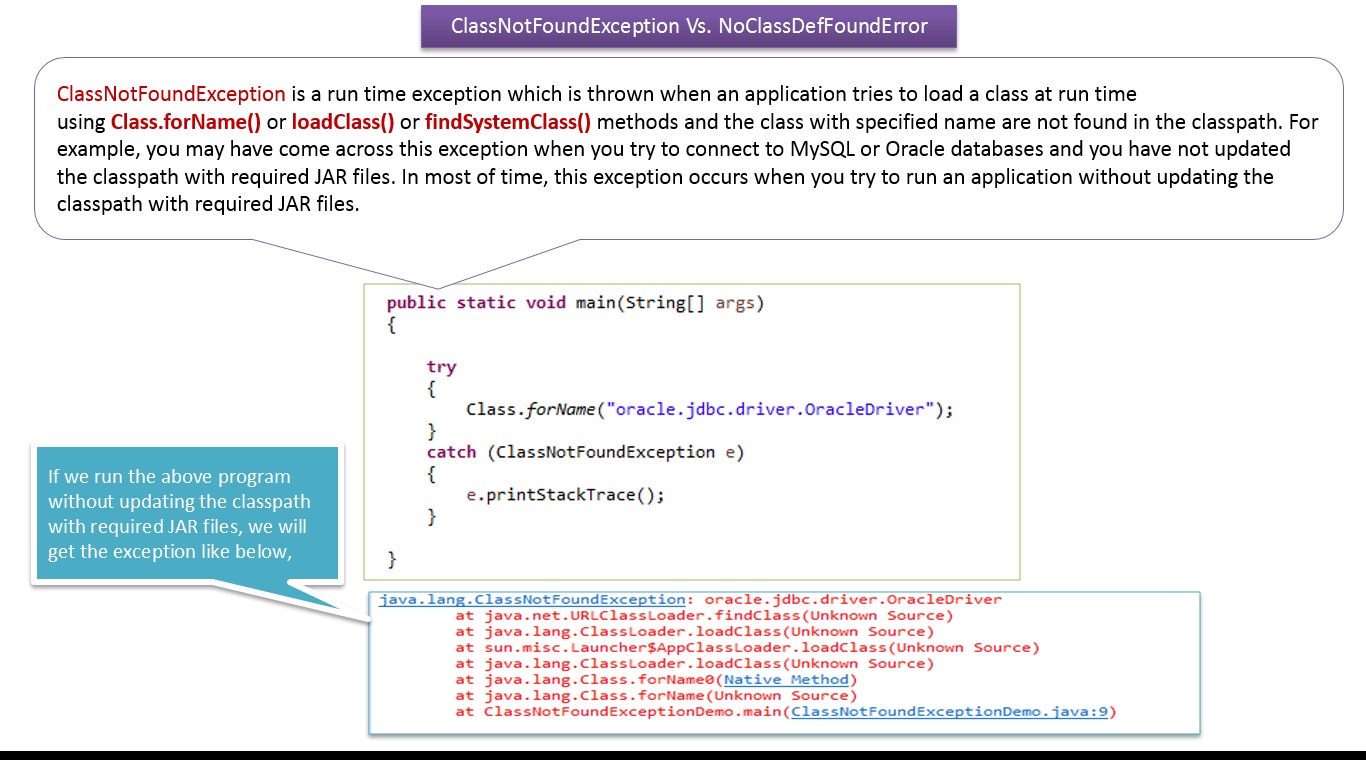 | Java Tutorial : Java Exception handling (ClassNotFoundException vs NoClassDefFoundError) |