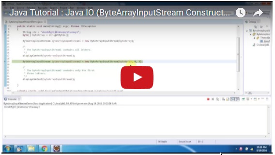 Click here to watch in Youtube :https://www.youtube.com/watch?v=5Tq1G2K5xaM&list=UUhwKlOVR041tngjerWxVccwByteArrayInputStreamDemo.java import java.io.ByteArrayInputStream;
