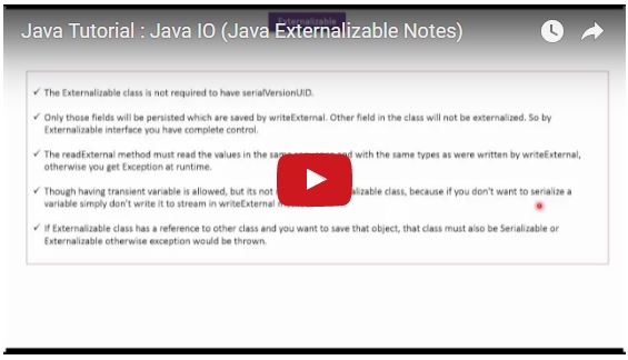 Java Tutorial : Java IO (Java Externalizable Notes) 0 replies on 1 page. |