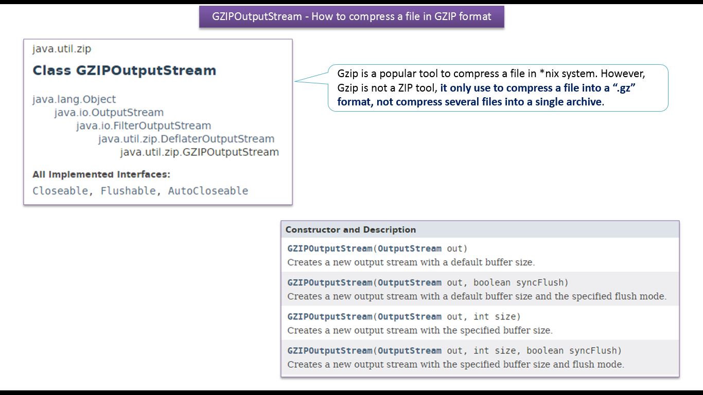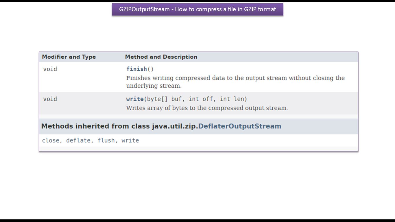 Refer:https://docs.oracle.com/javase/8/docs/api/java/util/zip/GZIPOutputStream.html