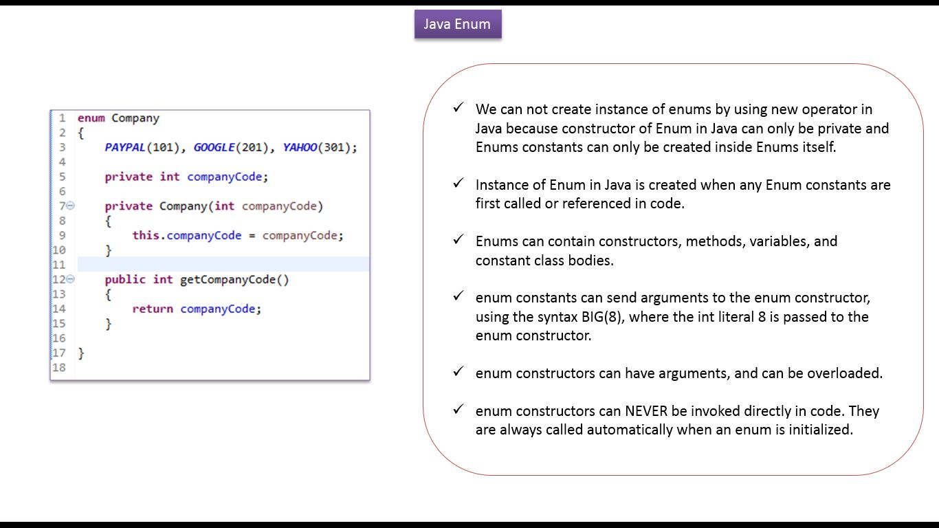 Java Tutorial: Enum in java[How to define a constructor and method in enum - Company] 0 replies on 1 page. |