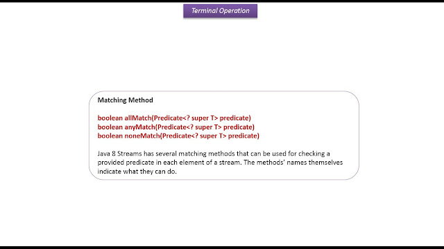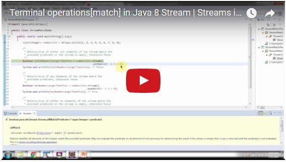 Click the below link to download the code:https://sites.google.com/site/ramj2eev1/home/javabasics/StreamDemo_Ter_Op_match_App.zip?attredirects=0&d=1Github Link:https://github.com/ramram43210/Java/tree/master/BasicJava/StreamDemo_Ter_Op_match_AppBitbucket Link:https://bitbucket.org/ramram43210/java/src/21c94b97f3d45cf2018afb81344804fbe9e1995b/BasicJava/StreamDemo_Ter_Op_match_App/?at=masterSee also: All JavaEE Viedos PlaylistAll JavaEE ViedosAll JAVA EE LinksServlets TutorialAll Design Patterns LinksJDBC TutorialJava Collection Framework TutorialJAVA TutorialKids Tutorial