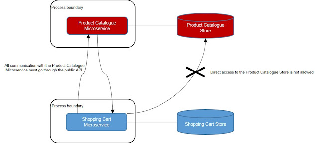 Figure 3 One Microservice cannot access another’s data store. All communication with a given Microservice happens through its public API; only the Microservice itself is allowed to access its data store directly