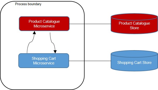 Now consider deploying a new version of the Shopping Cart Microservice. We either would have to redeploy the Product Catalog Microservice too, or would have some sort of dynamic code loading capable of switching out the Shopping Cart code in the running process. The former option goes directly against Microservices being individually deployable. The second option is complex and at the very least puts the Product Catalog Microservice at risk of going down because of a deployment to the Shopping Cart Microservice.