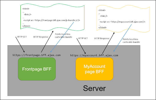 First notice that the obvious solution to the first bullet - allowing clients to cache shared CSS and JS - is to put the shared CSS and the shared JS in two bundles - a CSS bundle and a JS bundle - and put the bundles at a known place. That way each single-page BFF can just address the bundle at the known place, as shown below. Since all pages refer to the same bundles the client can cache them.