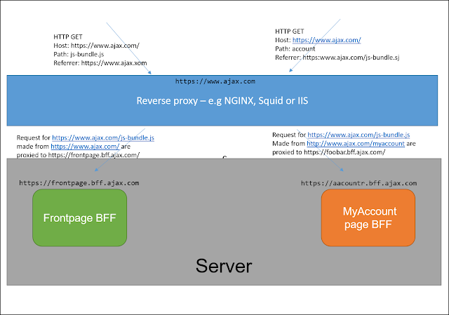 The trick implementing this is to have the reverse proxy look at the referrer of any request for one of the bundles - if the referrer is frontpage, the request is proxied to the frontpage single-page BFF, if the referrer is the my account page, the request is proxied to the MyAccount single-page BFF. That means that the bundles loaded on the frontpage is the bundles deployed in the frontpage single page BFF. Likewise the bundles loaded on the my account page come from the MyAccount single-page BFF. But from the client perspective the bundles are on the same URL - i.e. the client is able to cache the bundles based on HTTP cache headers.