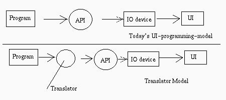 Translator model requires program side to talk to a translator, but not API. The content of communication between translator and program is not depended on any API. And then let the translator to talk to API, API talk to IO devices and finally a UI appears.
