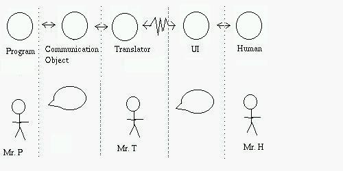 The mechanism starts from the point when a program wants to communicate with human. Program side talks to translator via a communication object, which contains the content of communication.